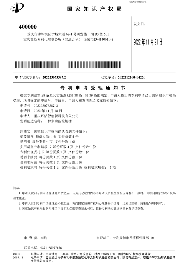 恭喜下發(fā)一種多功能垃圾桶實用新型專利證書
